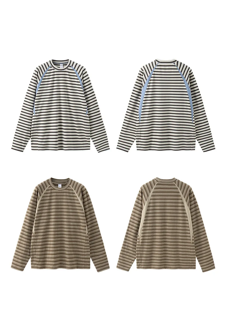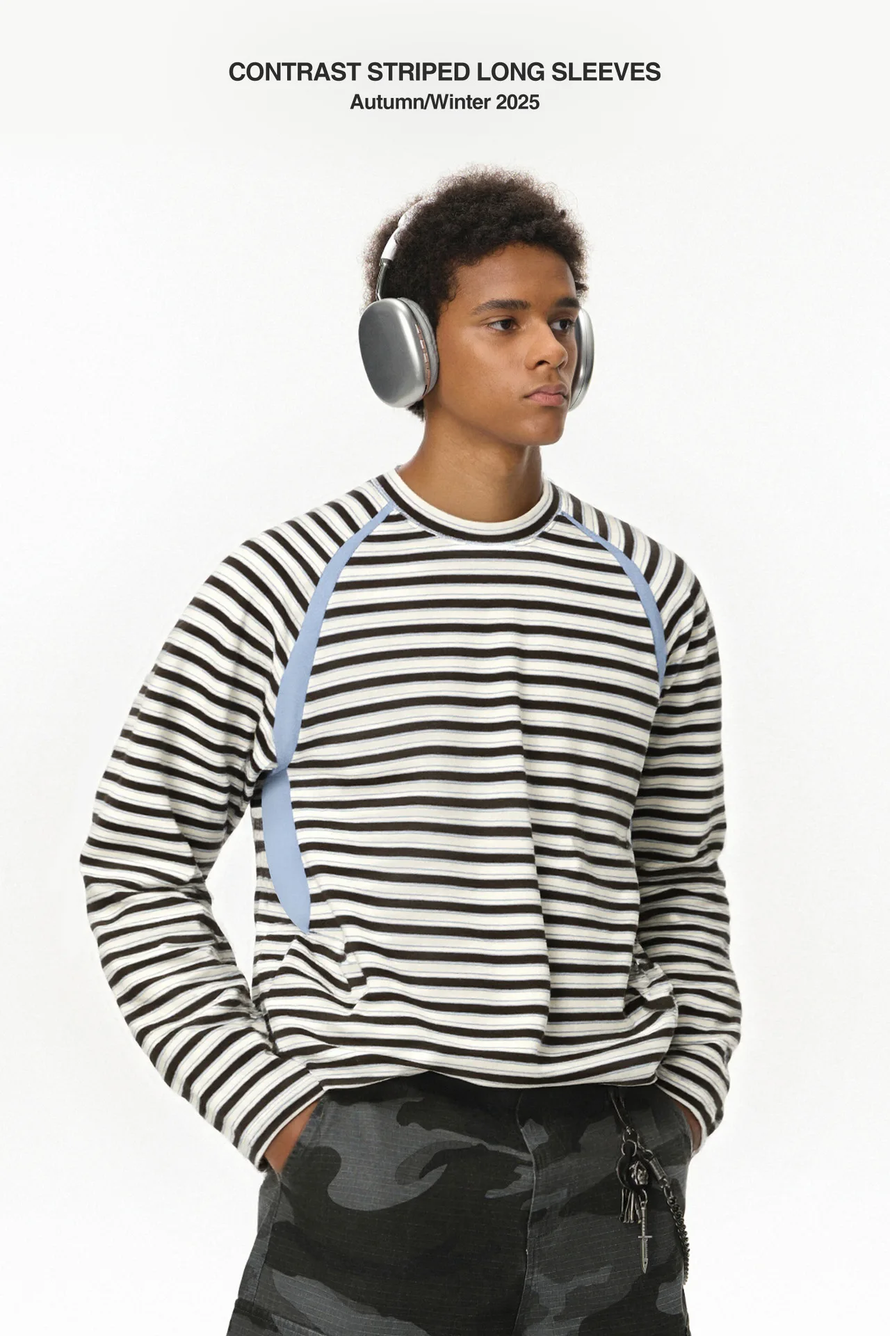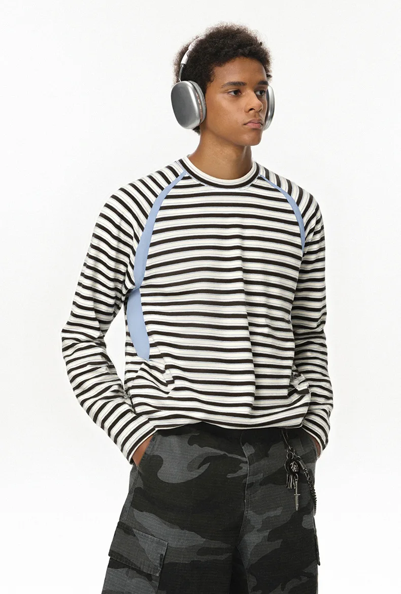 Color Block Streetwear T-Shirt Men's Loose Fit Long Sleeve Striped Top American Style Casual Shirt Crewneck Pullover Fall Winter